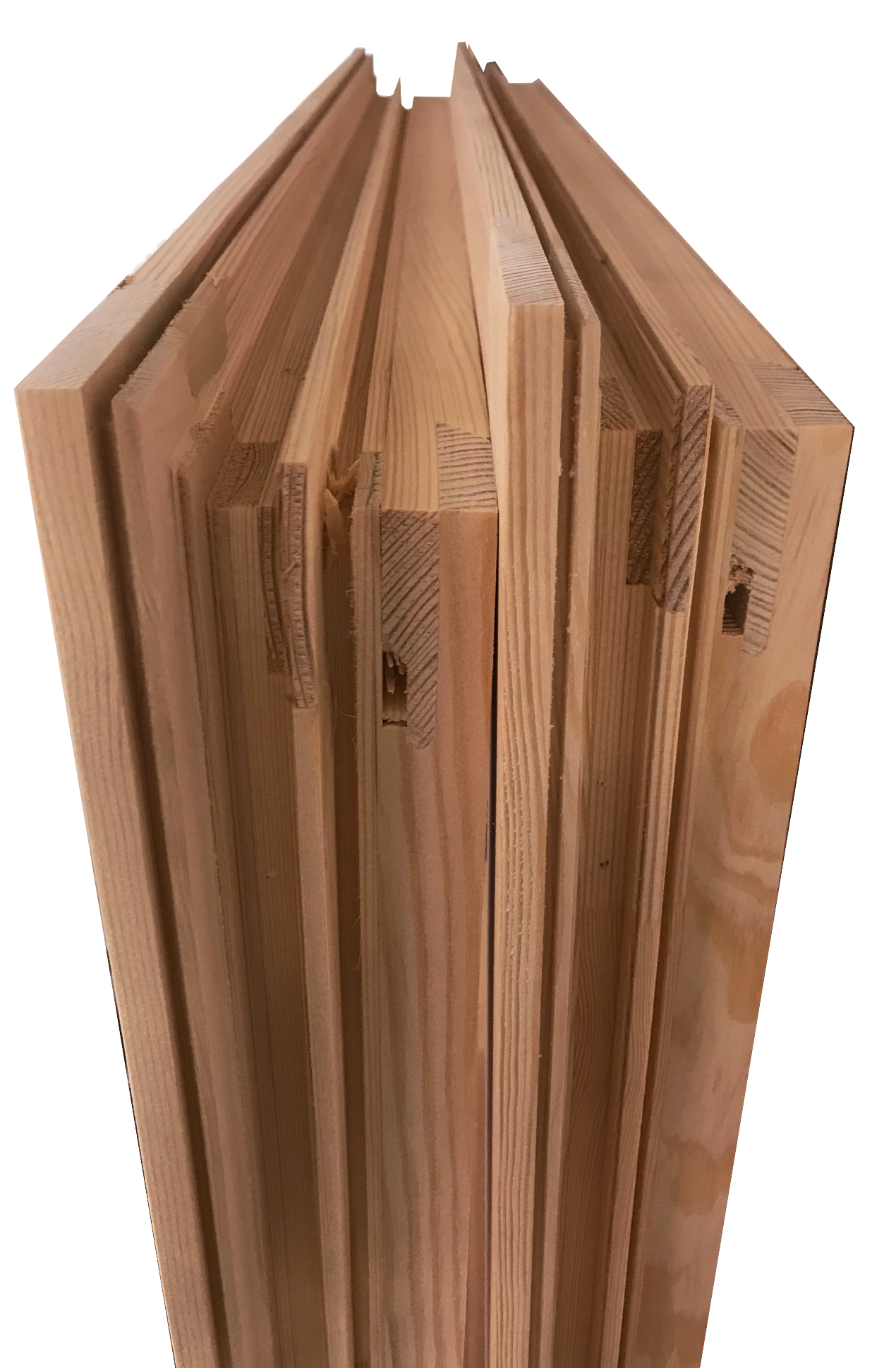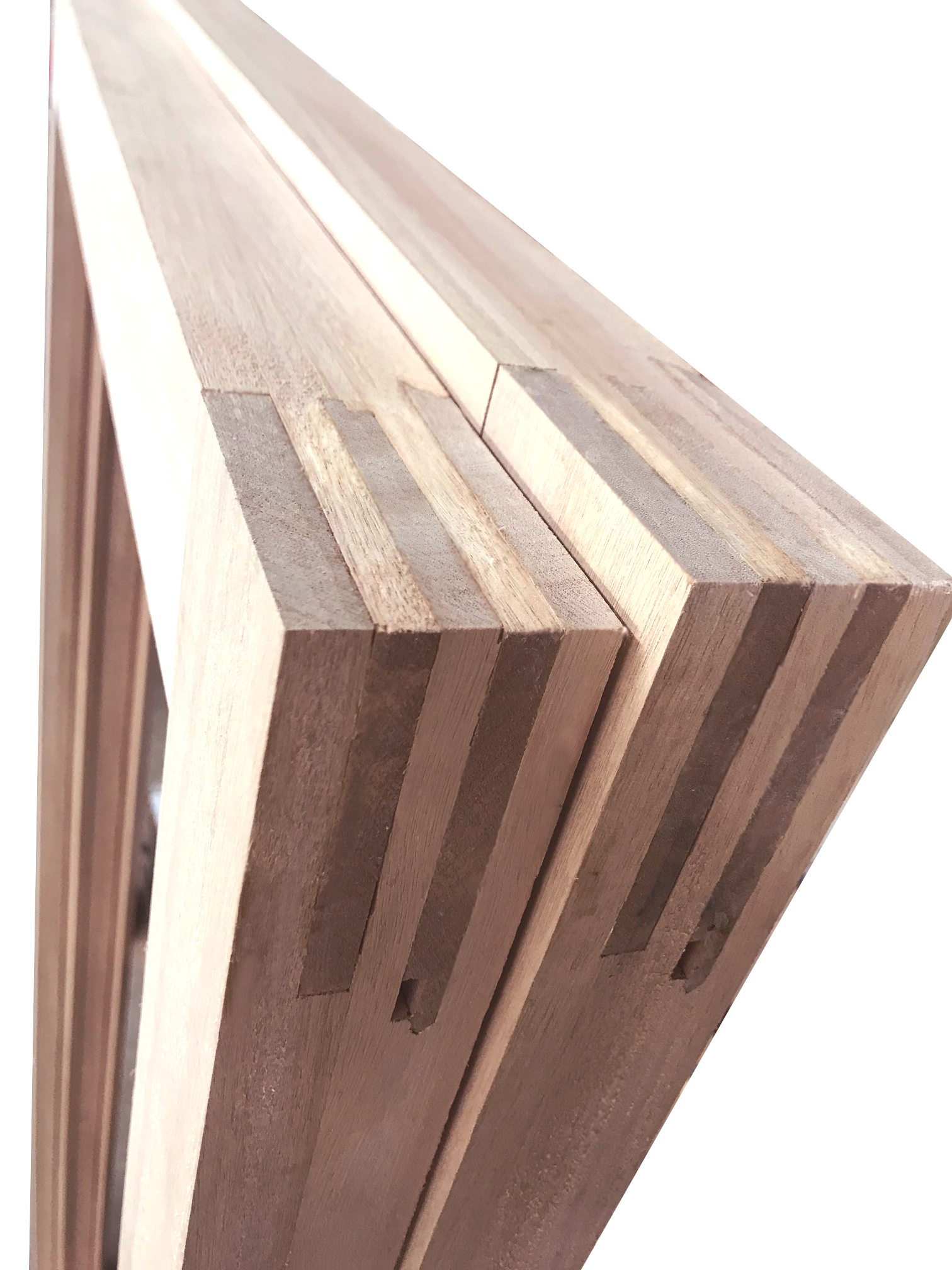 Laminated timber guarantees superior performance and durability compared with solid blocks. We typically offer high quality laminated meranti +450 kg/m³ as a basis.